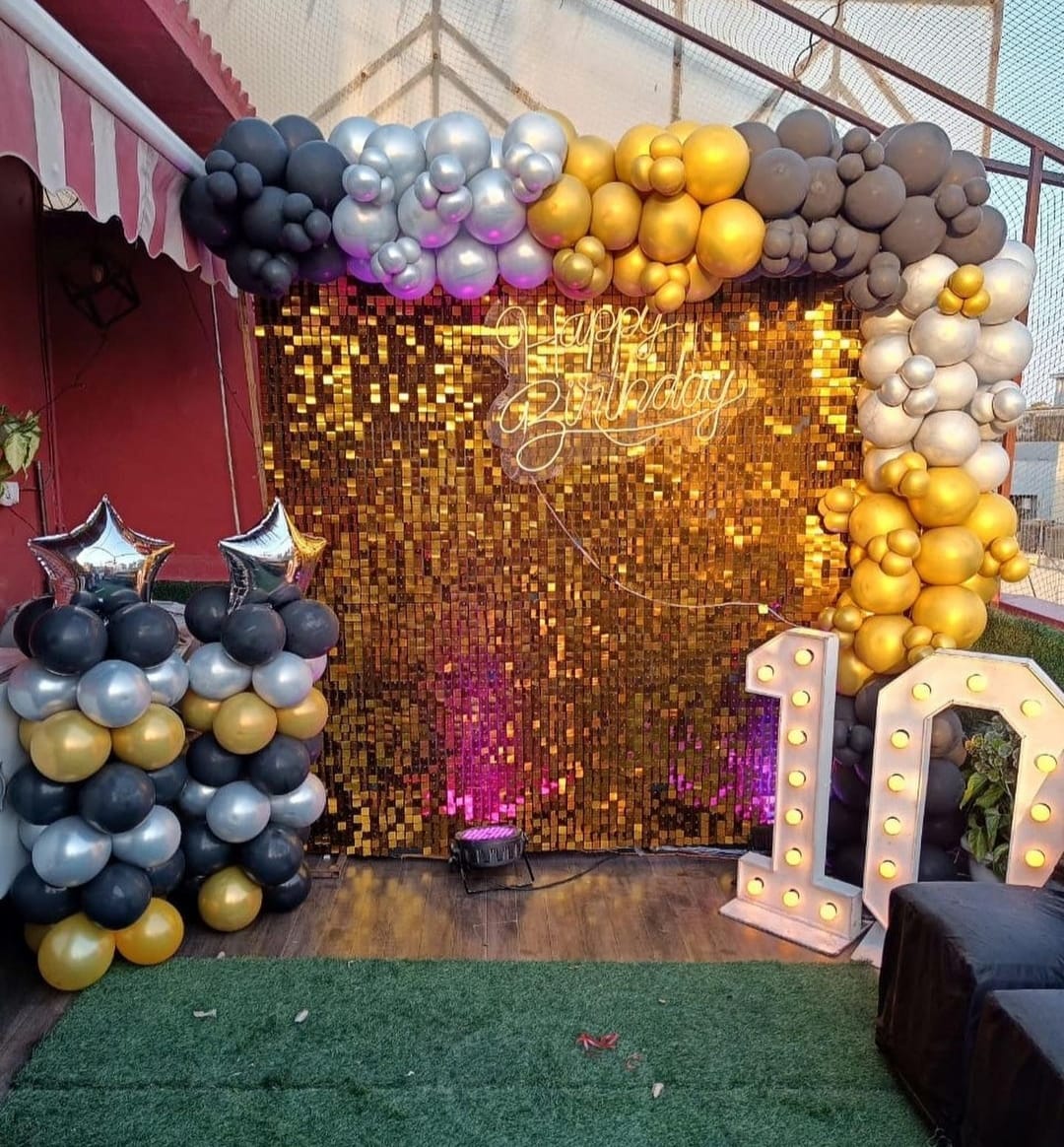 Golden Sequin Backdrop: A luxurious gold shimmer wall that creates a sparkling, photo-friendly background for any party.